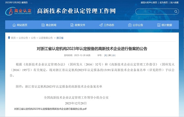 2023年12月28日,全國高新技術(shù)企業(yè)認(rèn)定管理工作領(lǐng)導(dǎo)小組辦公室發(fā)布《對浙江省認(rèn)定機構(gòu)2023年認(rèn)定報備的高新技術(shù)企業(yè)進行備案的公告》,中國能源工程集團有限公司(以下簡稱“中國能源工程集團”)所屬中清能源(杭州) 有限公司...